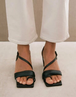 Based in Barcelona, ALOHAS is all about sustainable footwear with a fresh look. Made of fine leather, these strappy asymmetrical sandals have a squared-off sole, toe loop and chunky kitten heels.