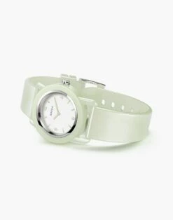 - Recycled thermoplastic polyurethane band with silver buckle closure.