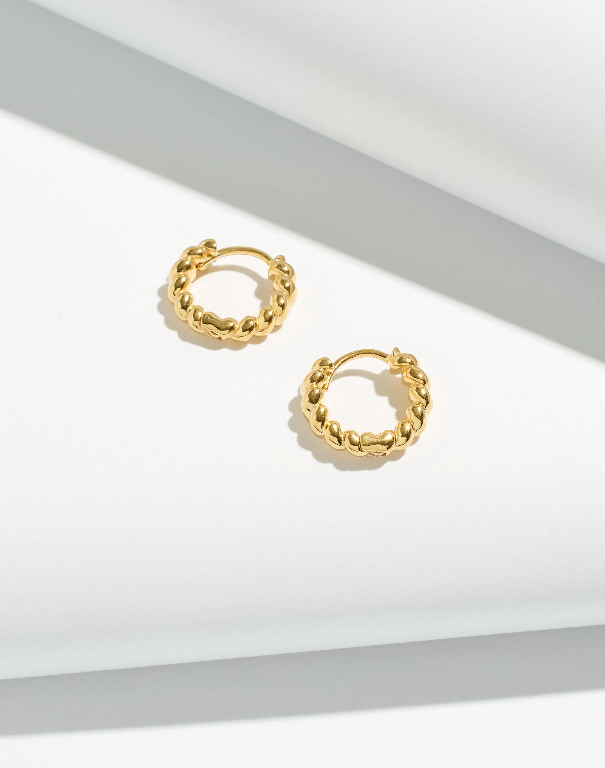 Crafted from 14k gold over sterling silver, the pieces in our Delicate Collection are future keepsakes meant to be layered and worn every single day (think of them as your jewelry BFFs). These huggie hoops have a puffy shape inspired by ’80s “shrimp” earrings.
