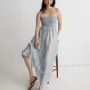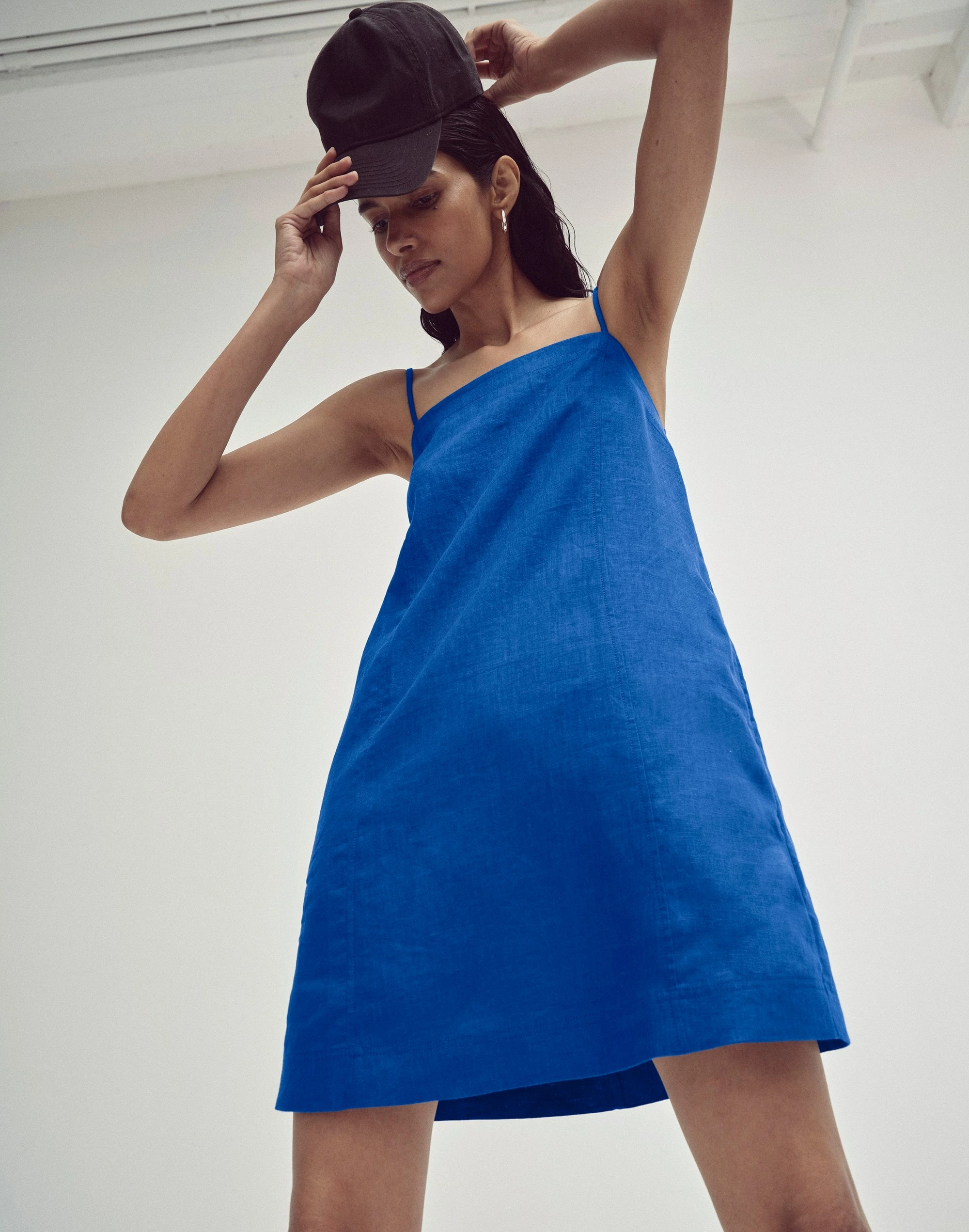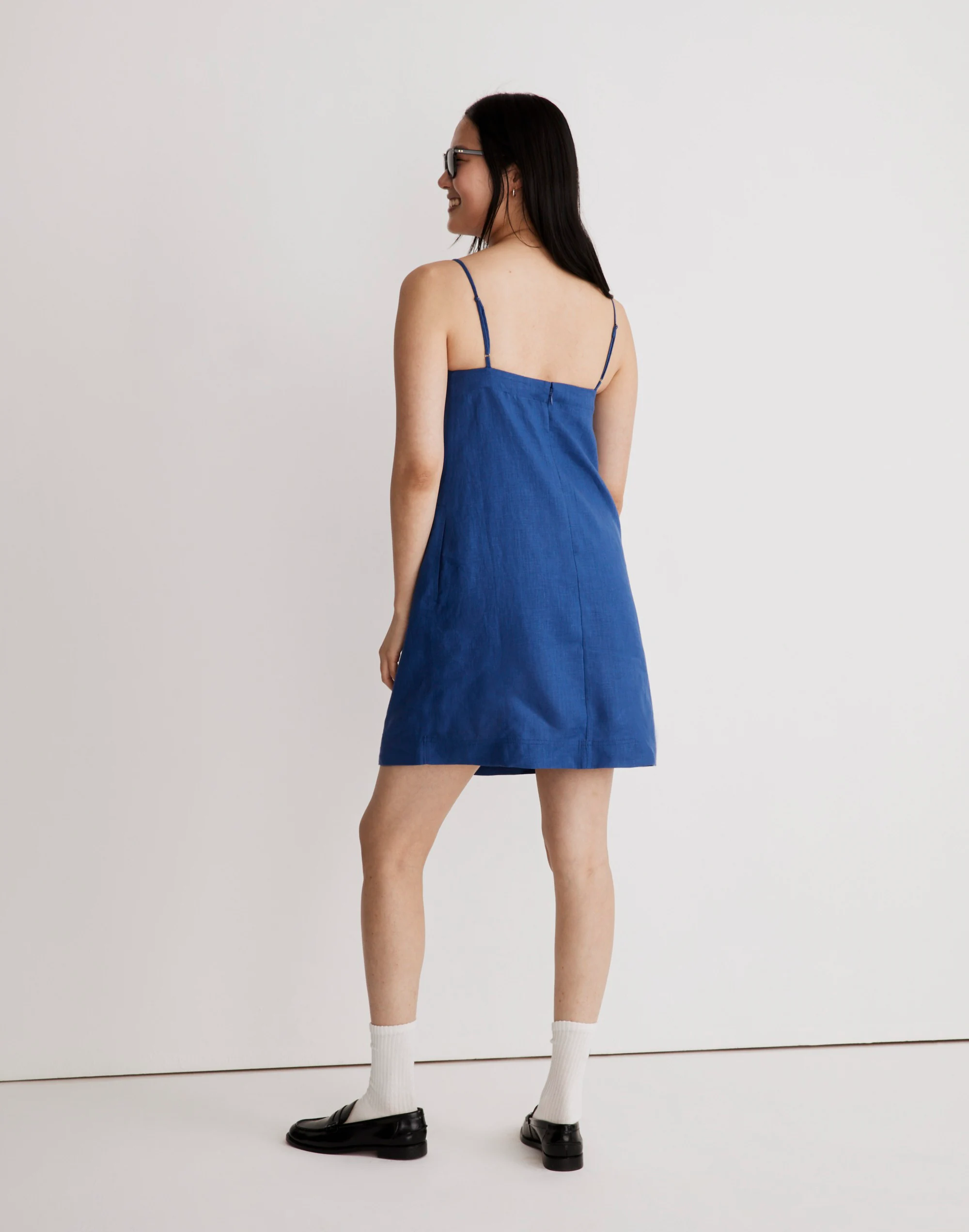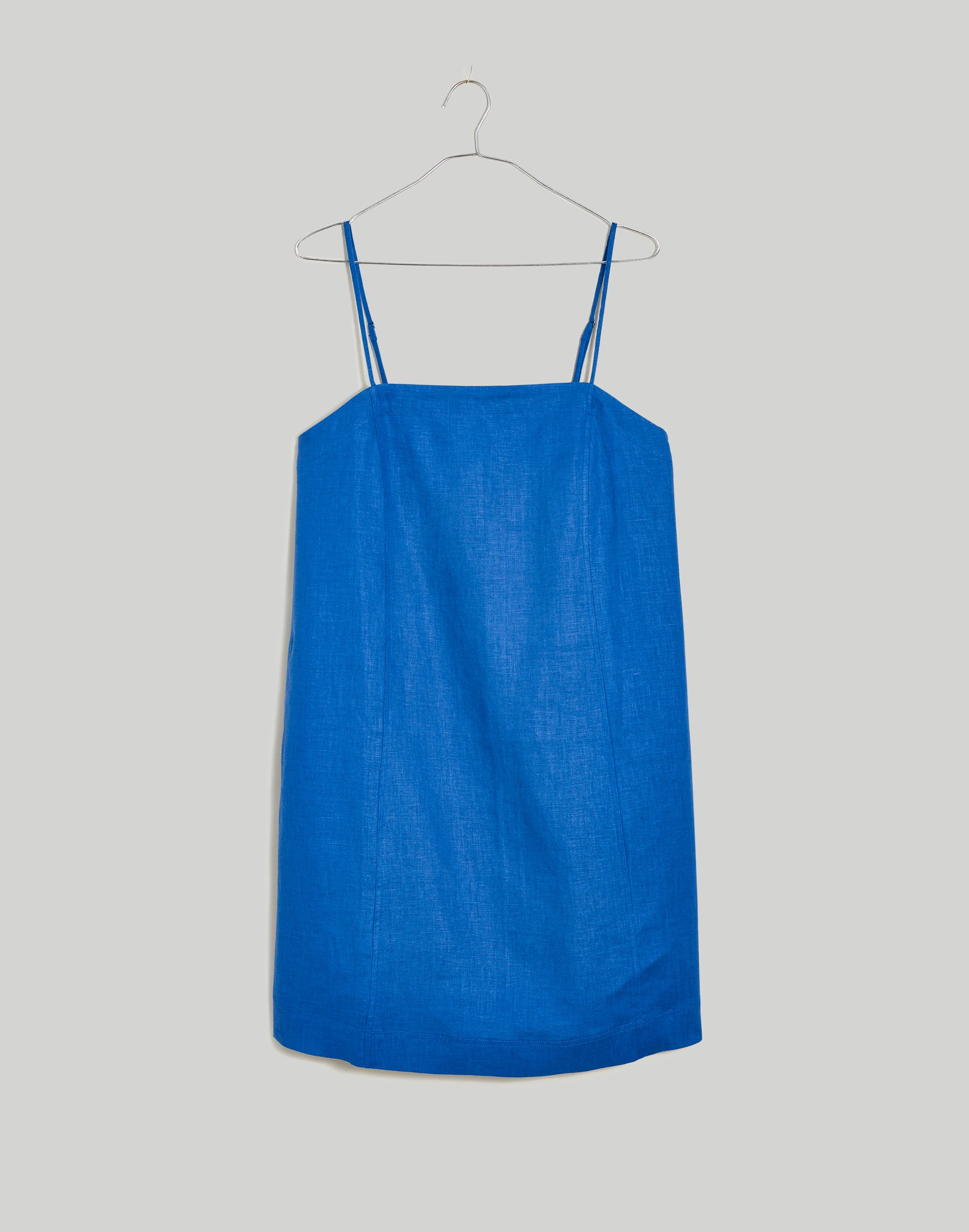 A total wardrobe staple in 100 percent linen, this versatile mini dress has a sleek square neckline and darting in the back, adding a little shape to this slip-on-and-go style.