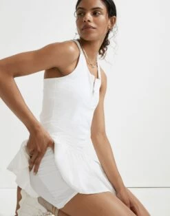 The fabric: engineered with four-way stretch and zero grin-through, MWL Flex is supersoft, sweat-wicking and made using recycled materials. The fit: a cropped tank with skinny bungee straps, a ruched sweetheart neckline and built-in shelf bra. The set: try it with the matching skort or your favorite high-rise jeans.