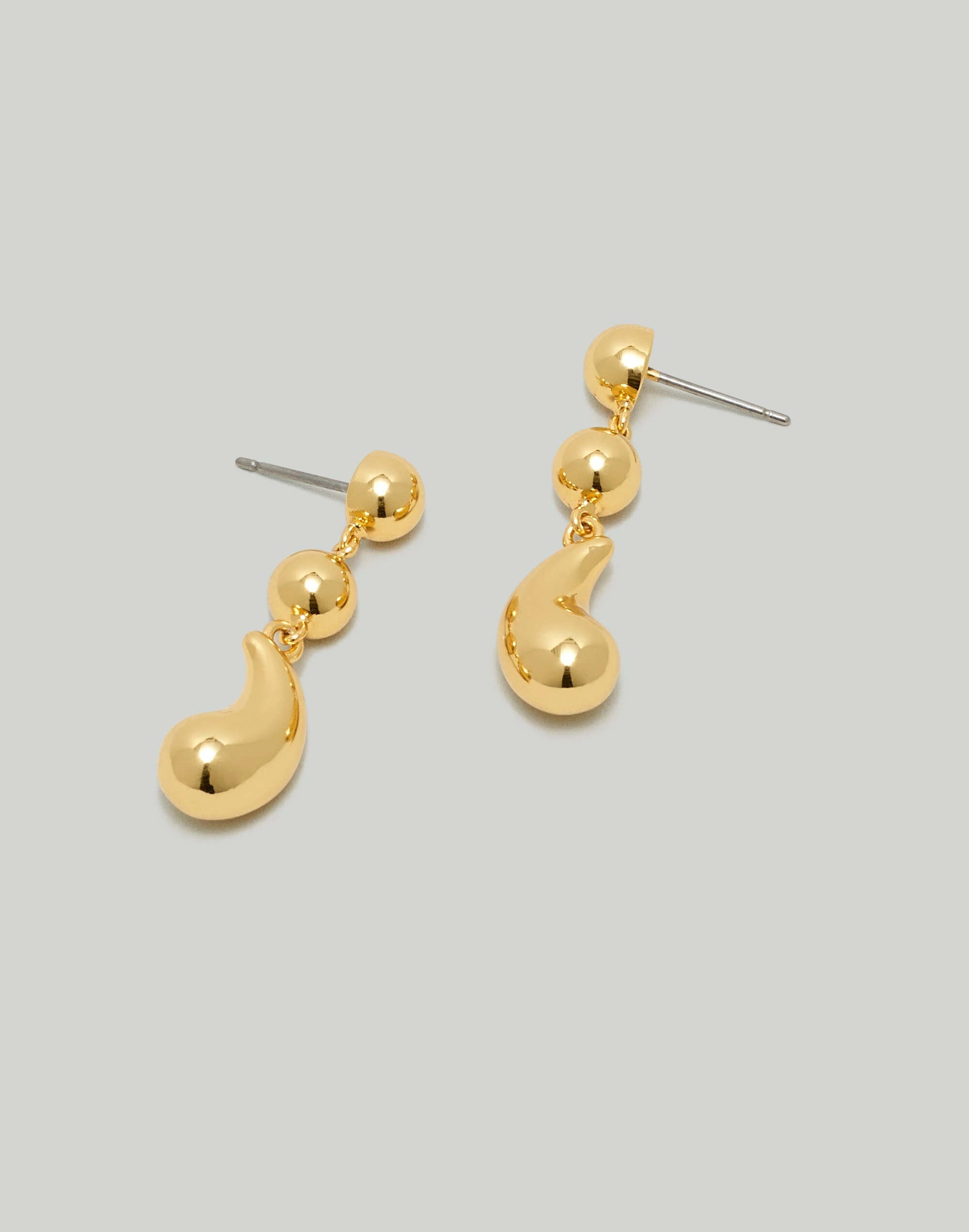 Cast in shiny gold-plated brass, these drop earrings feature puffy teardrop-shaped charms dangling from tiny rounded studs.