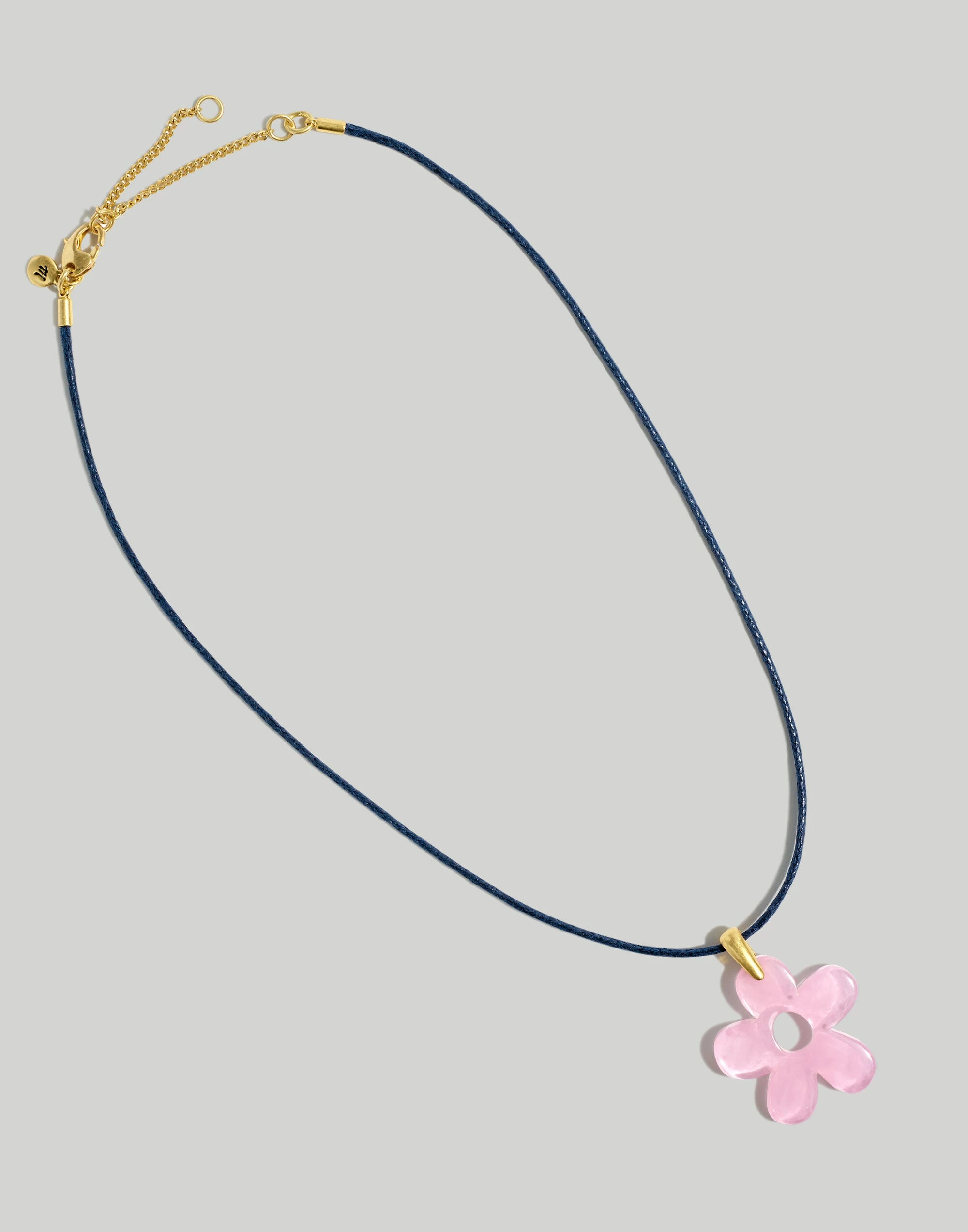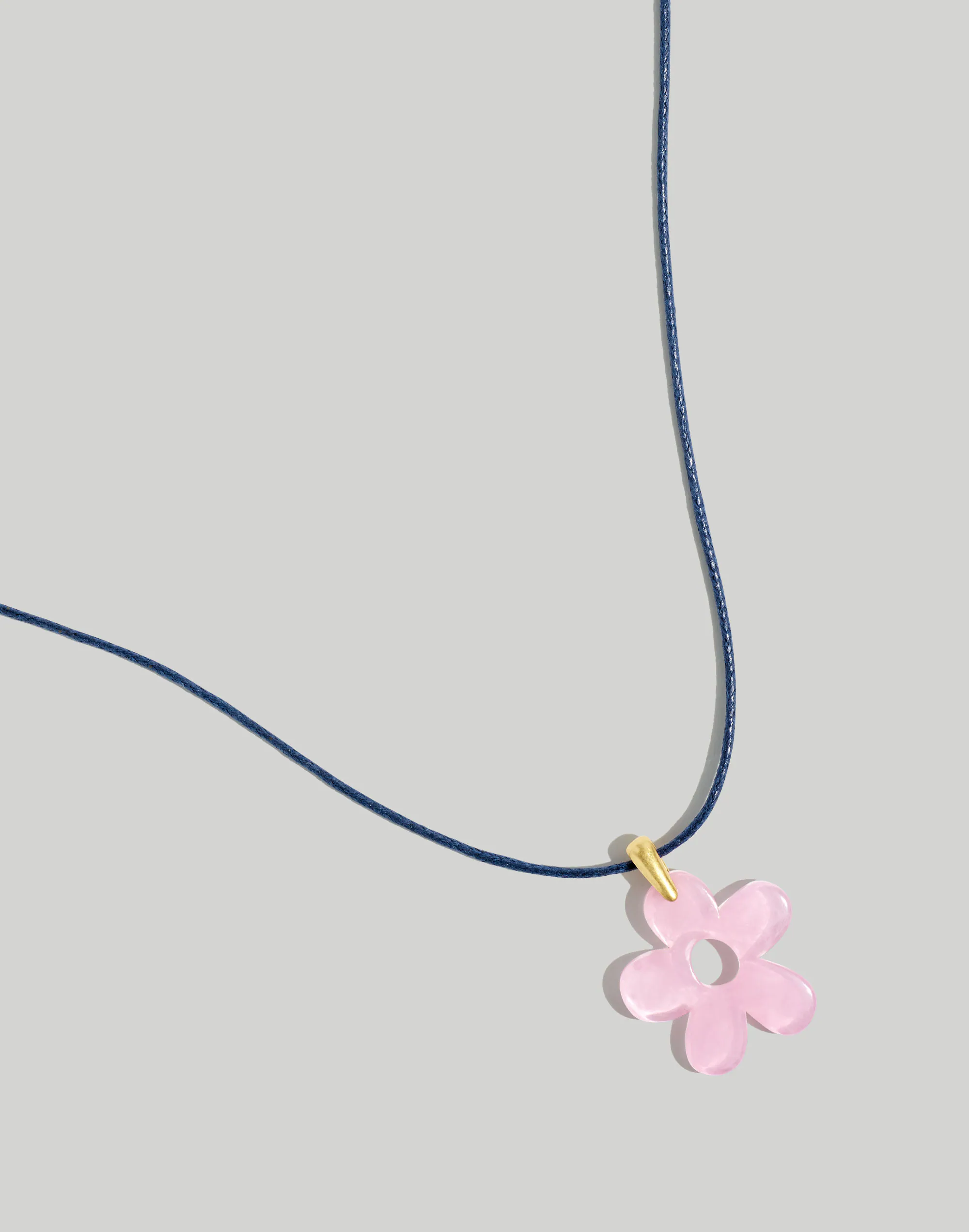 Strung on cotton cord, this statement necklace features a colorful flower-shaped resin pendant. Pair it with the matching earrings for a full on floral look.