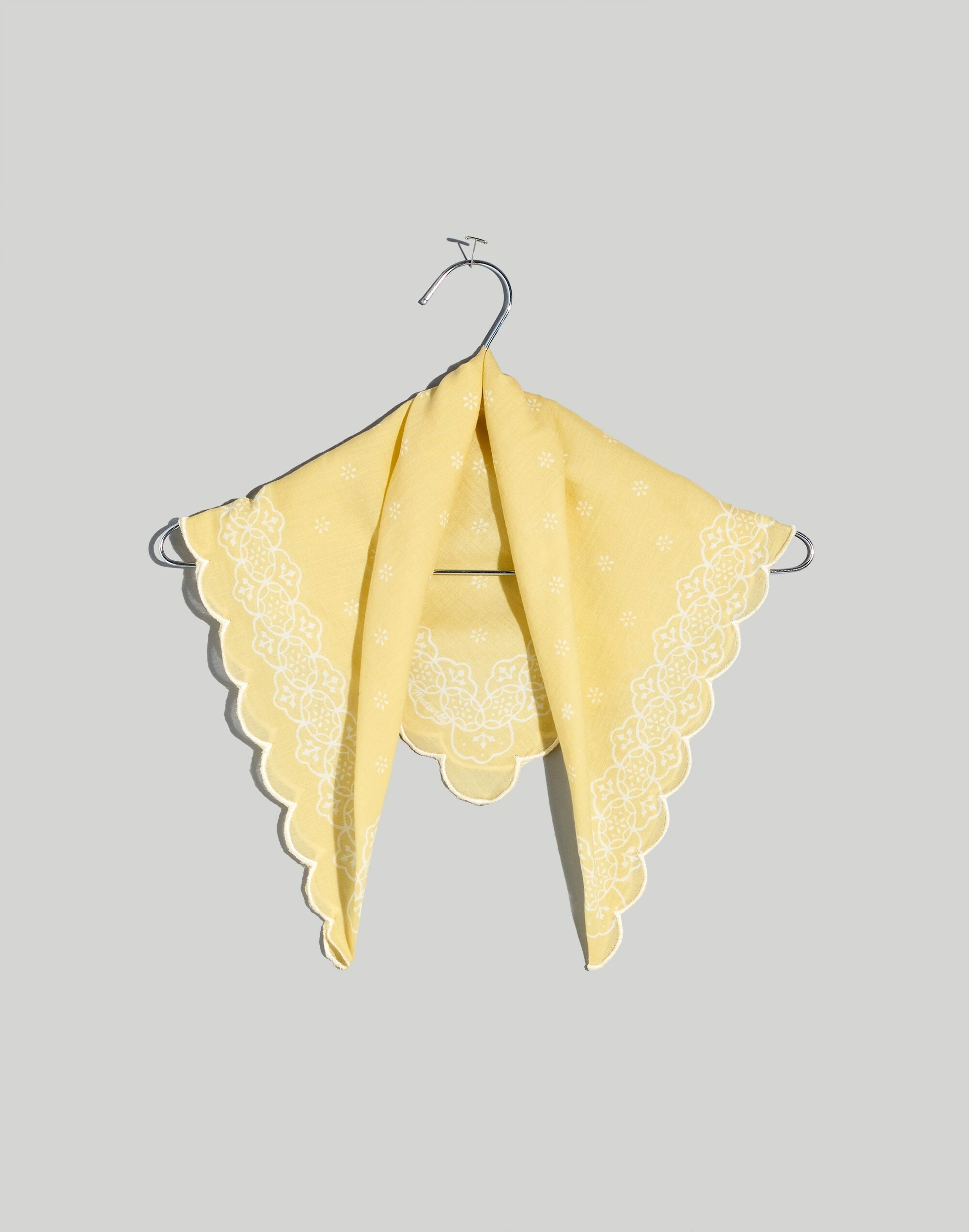 Made of 100 percent cotton with a fun polka dot print and scalloped edges, this bandana can be worn as a handkerchief, tied onto a tote or wrapped around your wrist—the ways to rock it are endless.