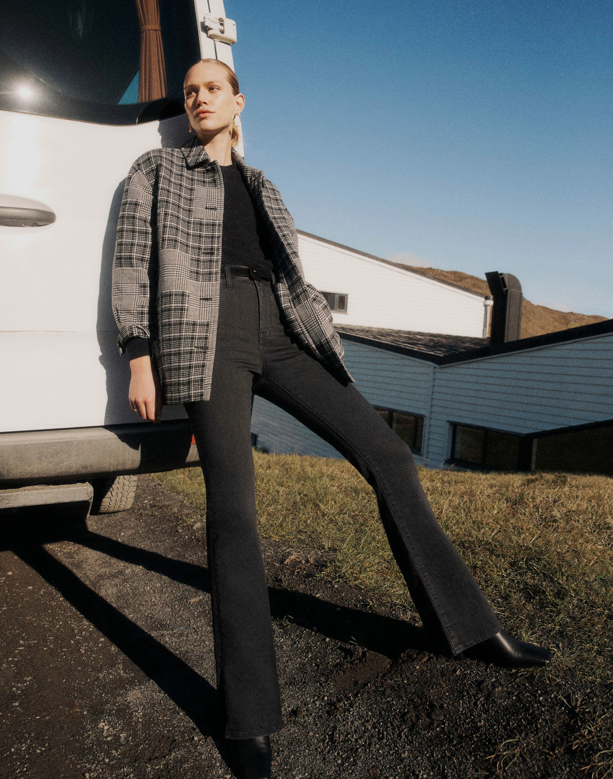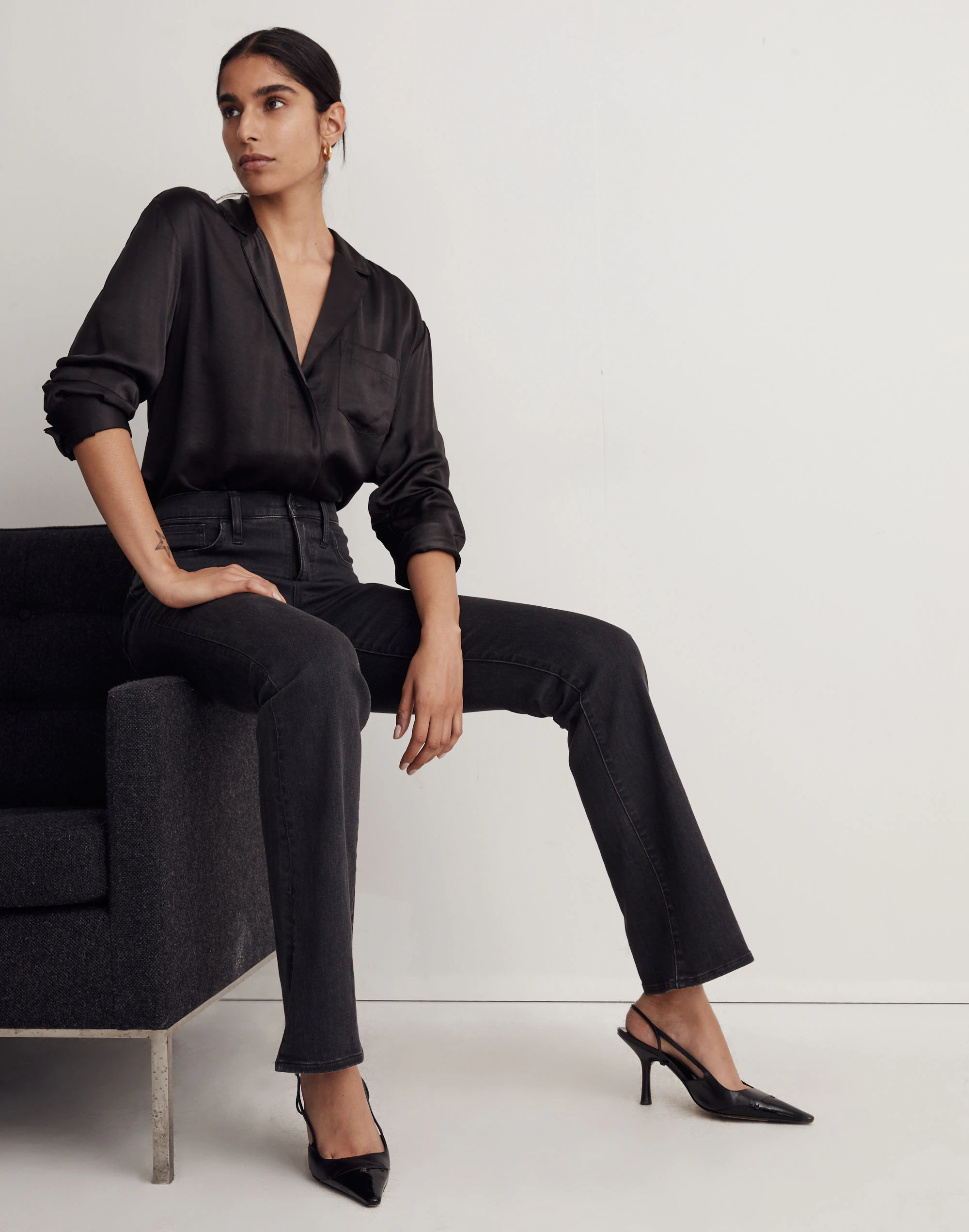 - 11″ high rise, fitted through hip and thigh, 17″ flare leg opening, 32″ full-length inseam.