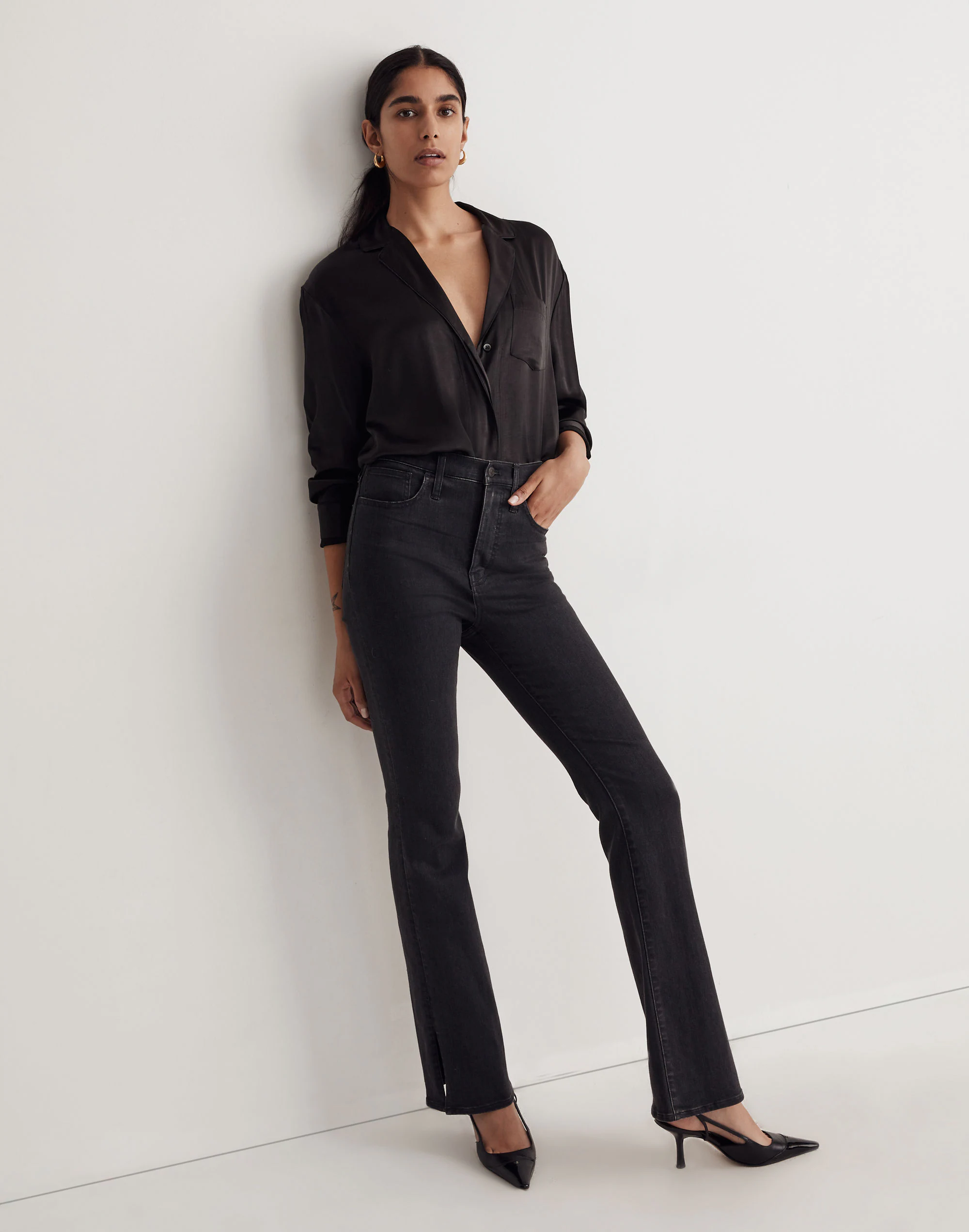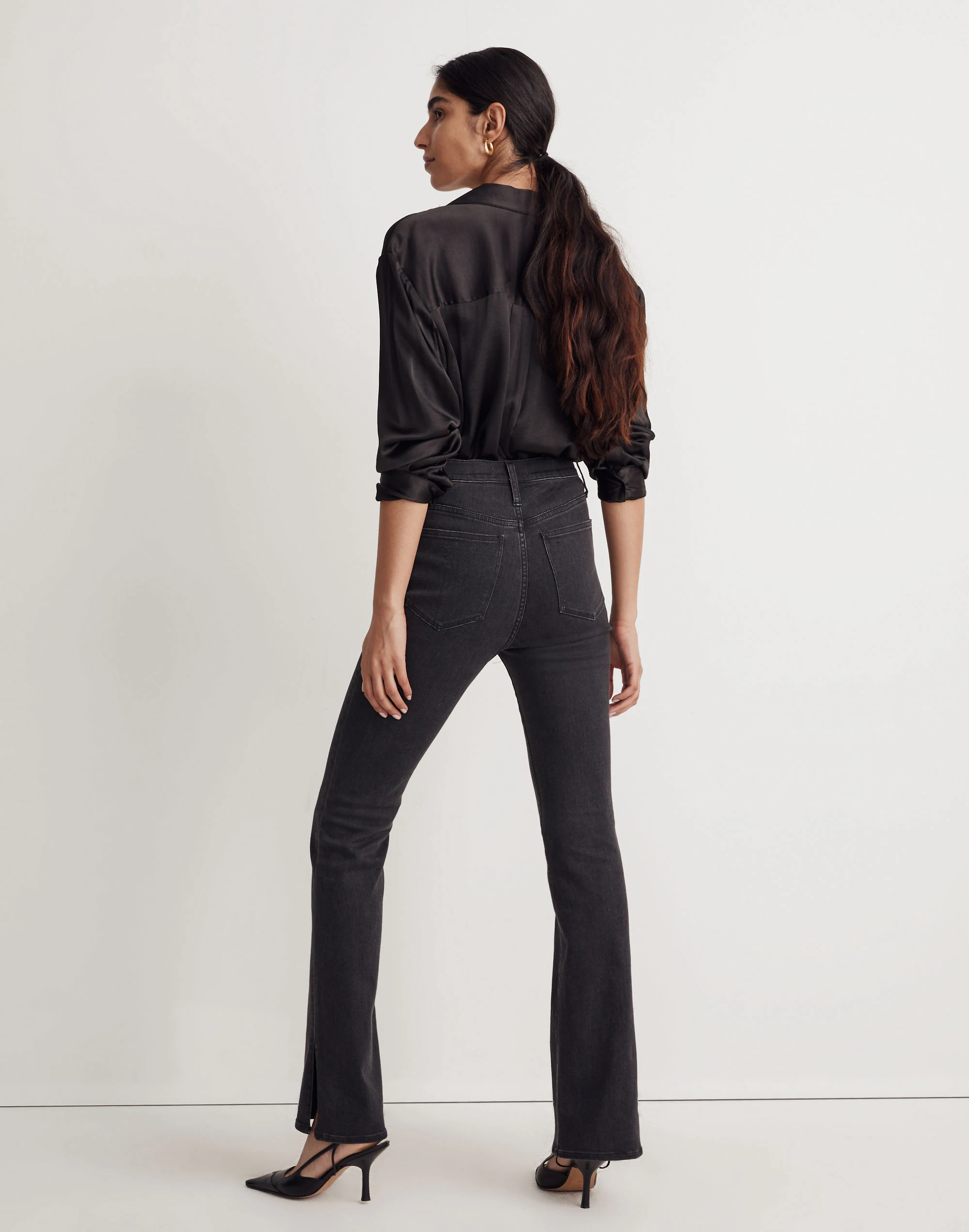 The cut: complete with the holds-you-in sorcery of our Magic Pockets® in front, these high-rise jeans are skinny to the knee before flaring into a demi-boot leg, plus, have slits on the sides to show off your shoes. The fabric: vintage-y structured denim with a touch of stretch for a broken-in feel.