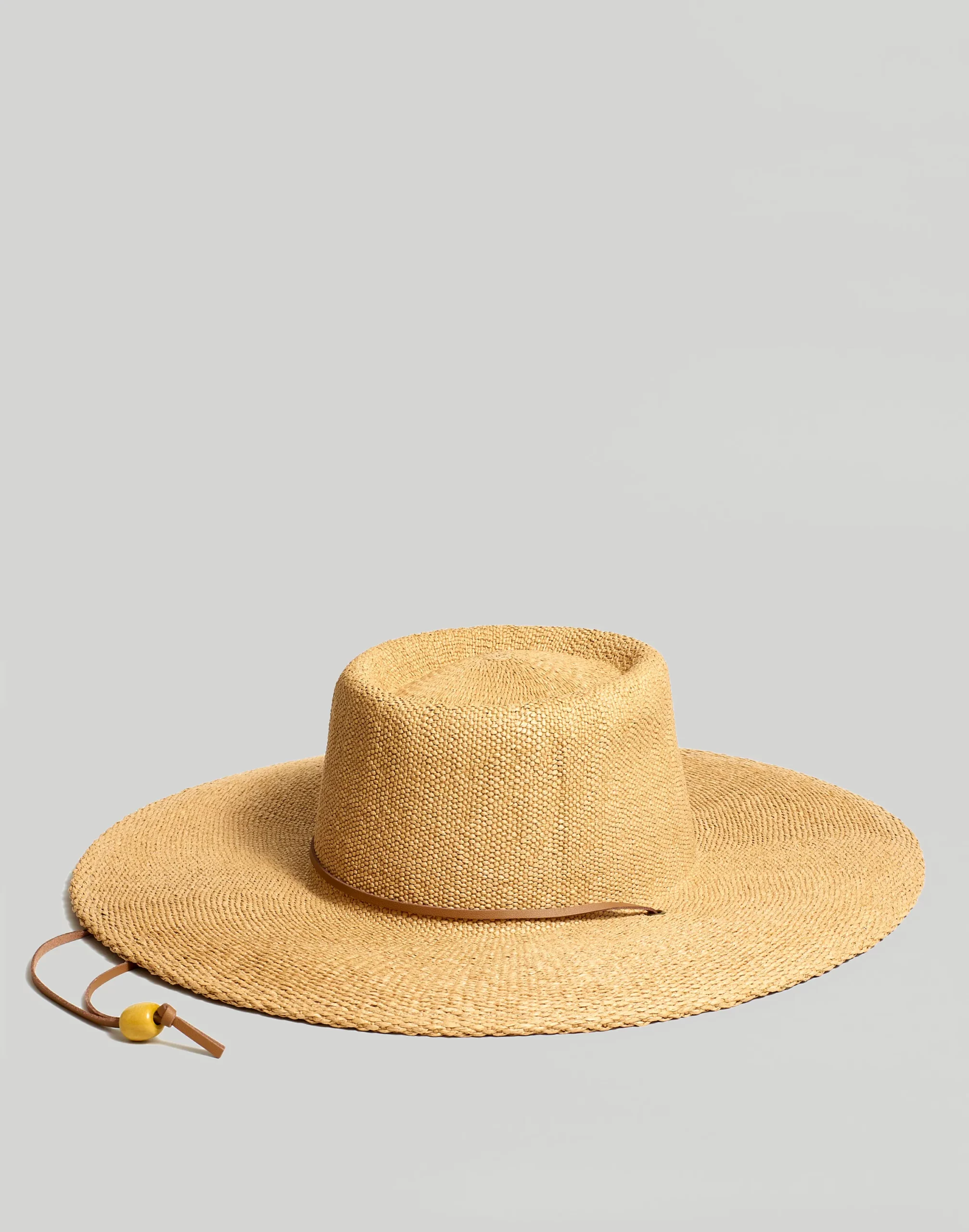 Woven of straw, this wide-brim hat has a dipped crown and stampede strap that can be worn to the front or the back.