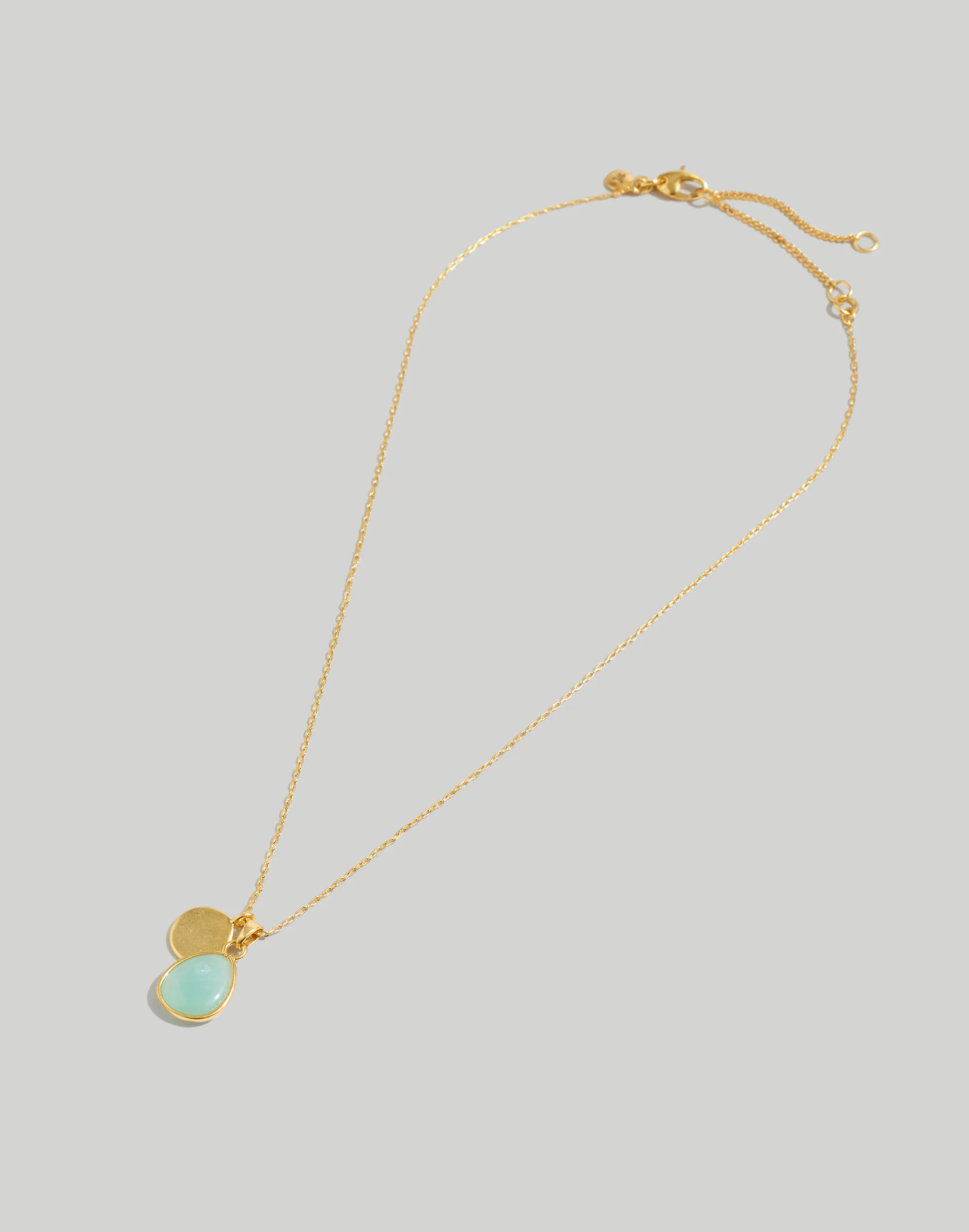 Pretty and powerful, our Stone Collection is made of wearable good vibes. On a low-key gold-plated recycled brass chain, this pendant necklace is hung with semiprecious amazonite (which, some say, has a soothing and clarifying energy).