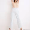 - 13 3/4″ mid rise, fitted through hip and thigh, 14 1/2″ tapered leg opening, 27″ inseam.