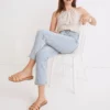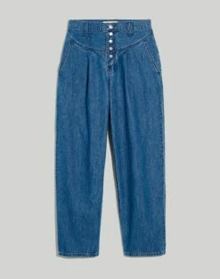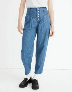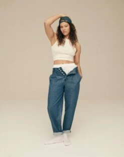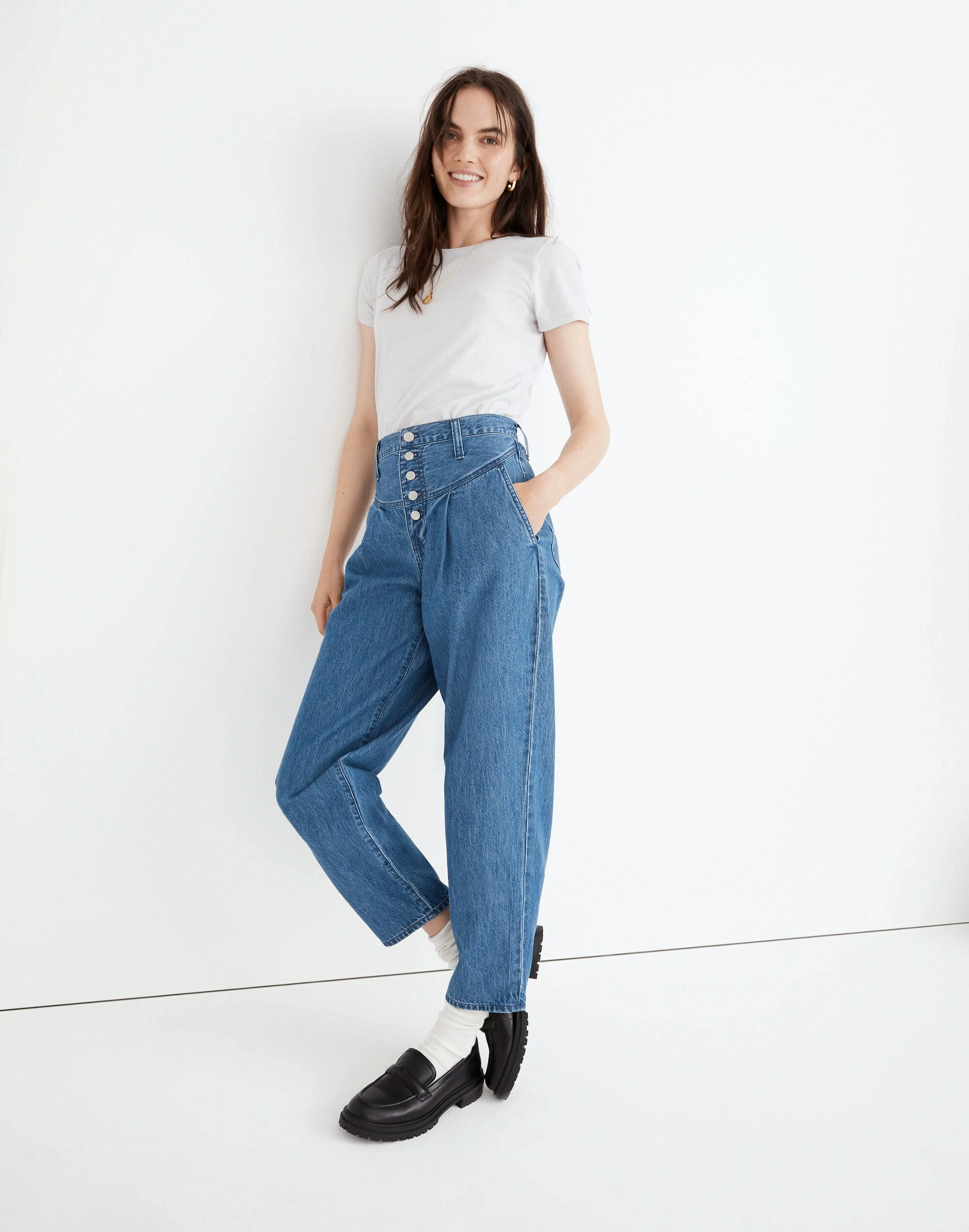 The cut: Uber ’80s and totally tapered, these full-length retro jeans have a pleated front yoke and slant pockets. The fabric: Drapey and lightweight 100 percent cotton denim with zero stretch.