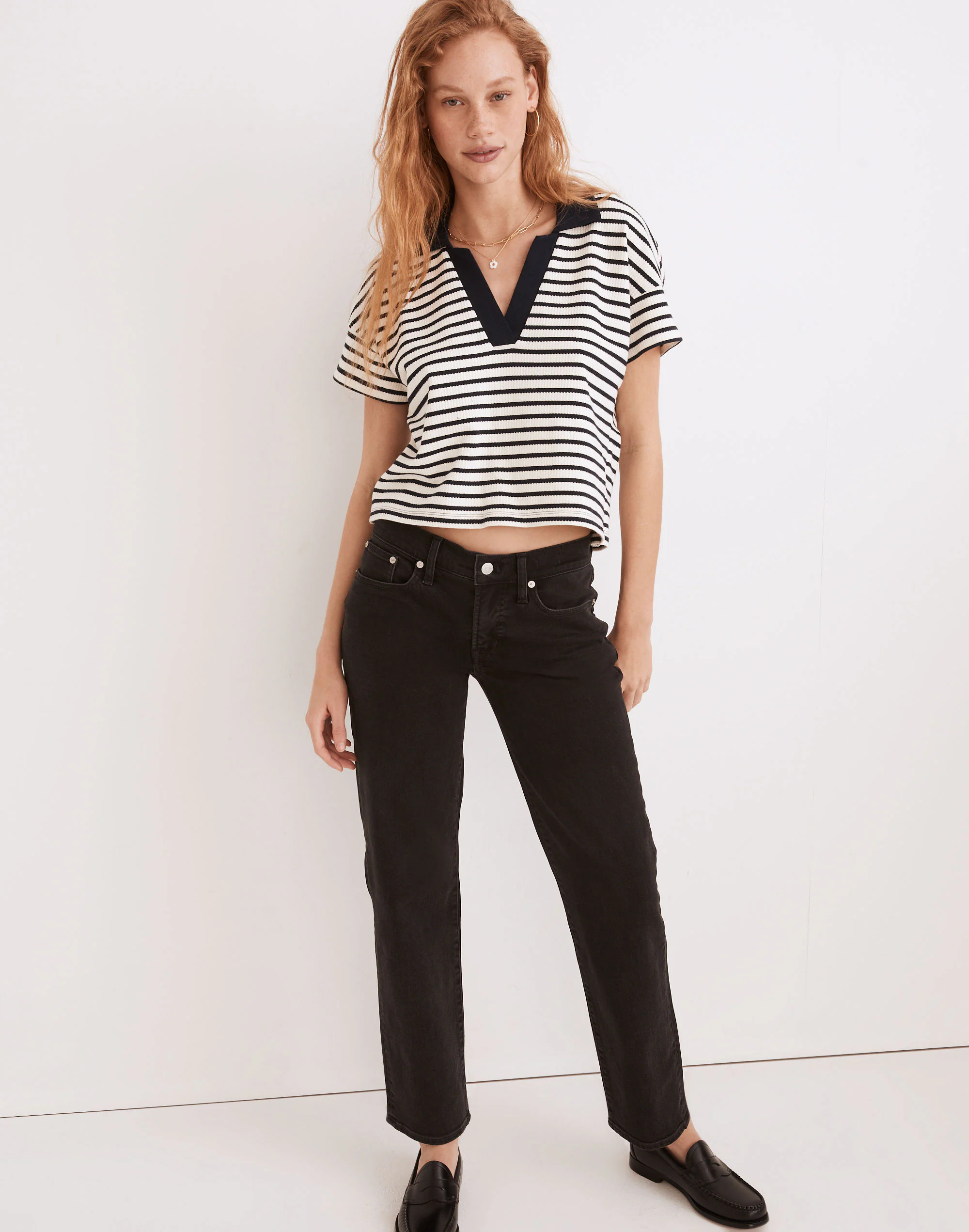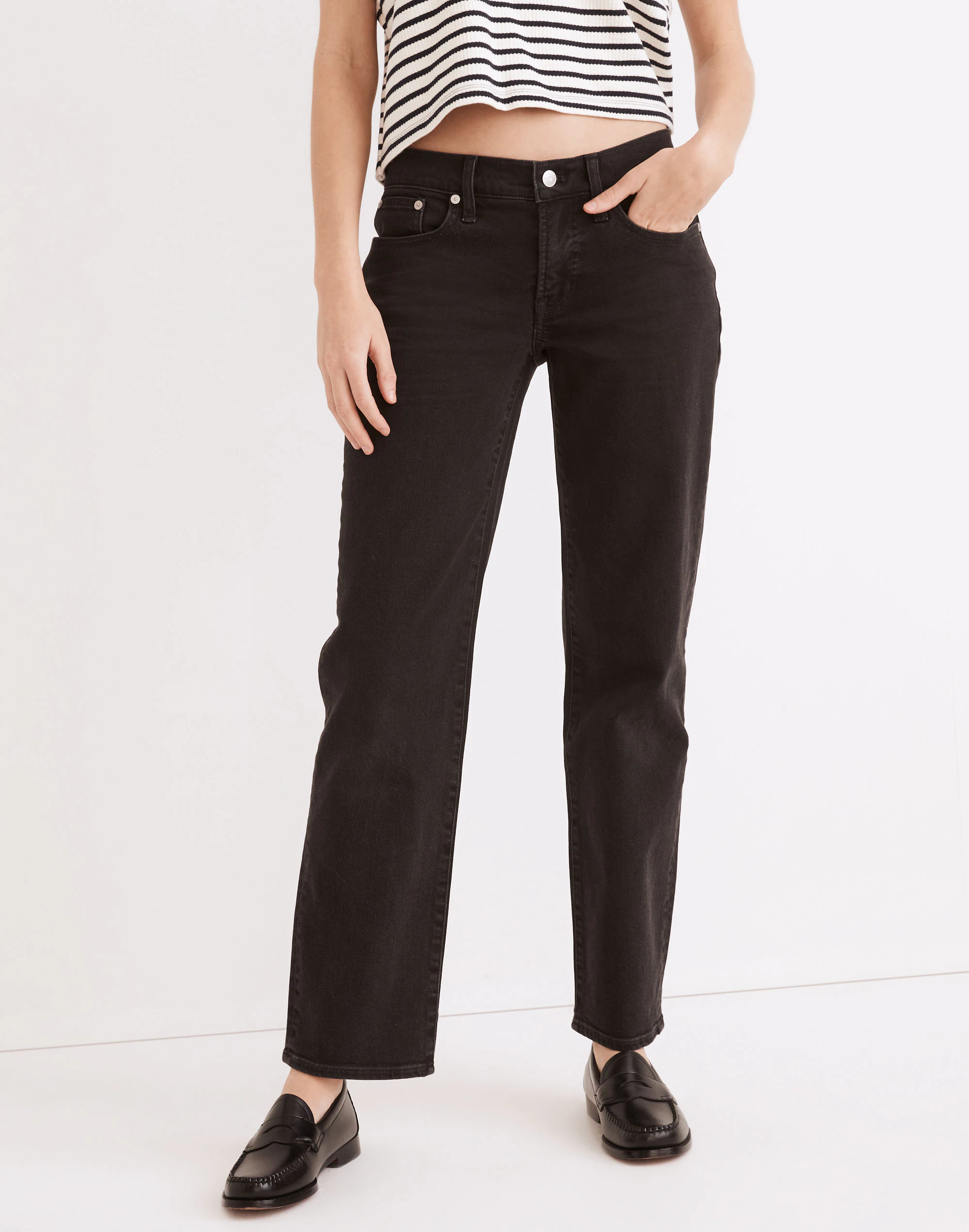 The cut: we reworked our best-selling straight momjeans with a slouchy low rise that sits on the hips (without flashing your undies). The fabric: premium denim that combines the holds-you-in structure of rigid with a touch of stretch for day-one comfort.