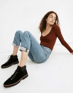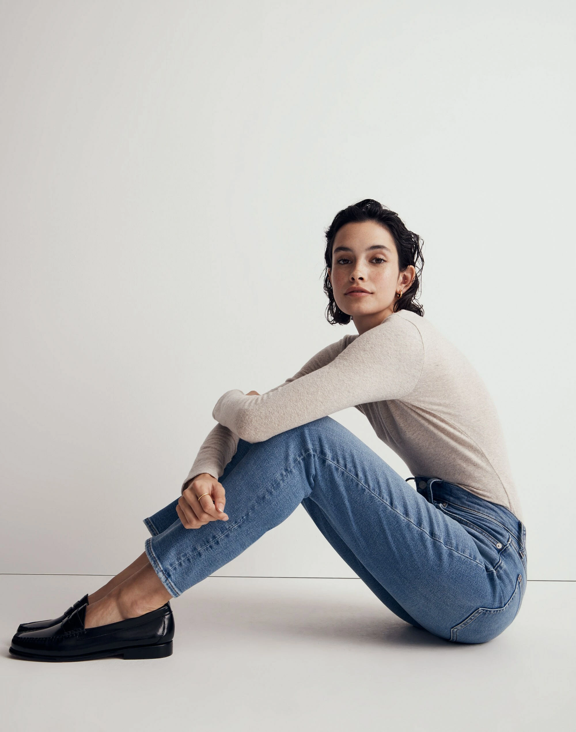 The cut: We reworked our best-selling tapered momjeans with a 9 1/2″ mid rise for a laid-back vibe (they’re great for everyone, but an absolute must if you’ve got a shorter torso). The fabric: Premium Orta stretch denim woven with TENCEL™ lyocell so it’s both soft to the touch and perfectly structured.