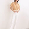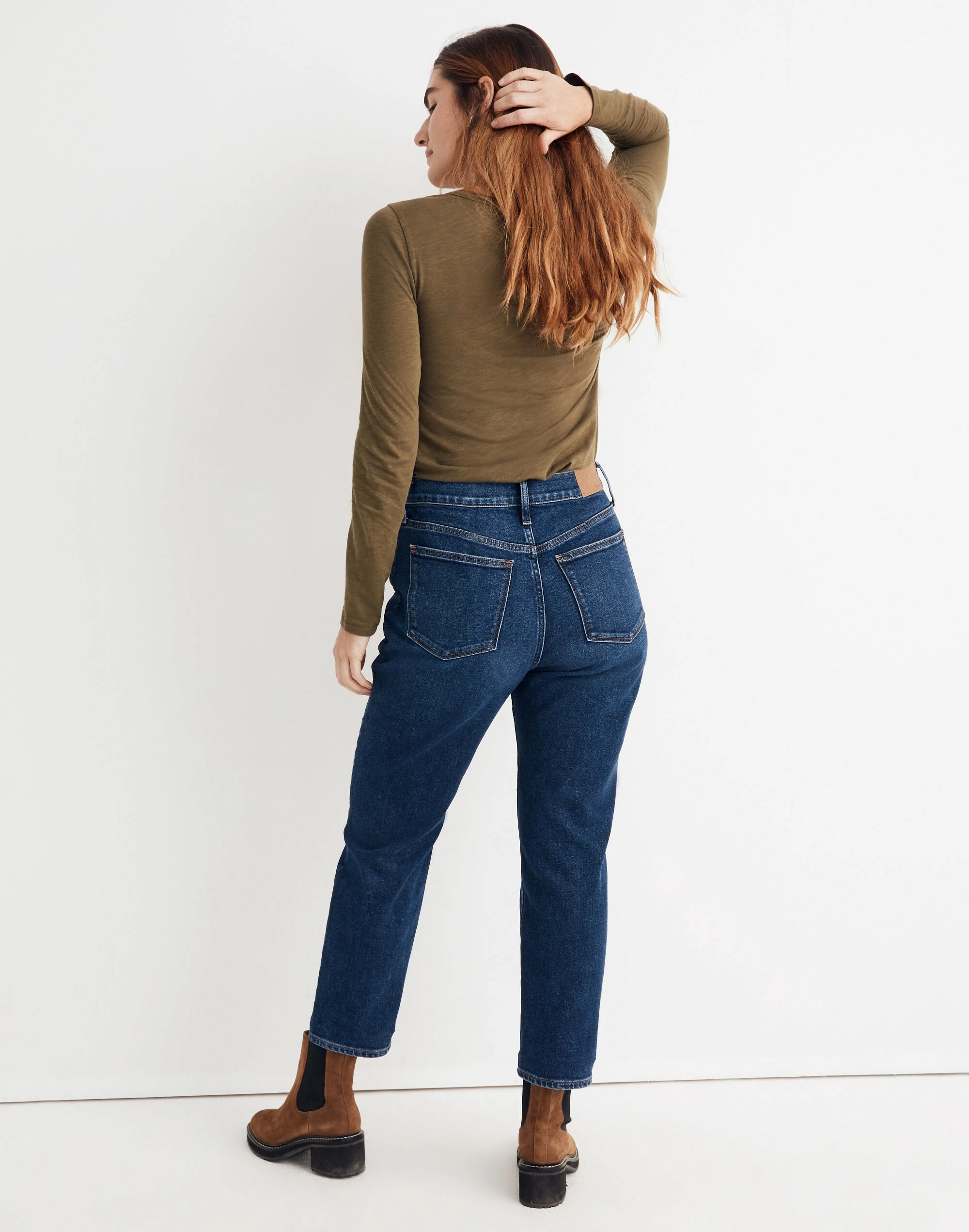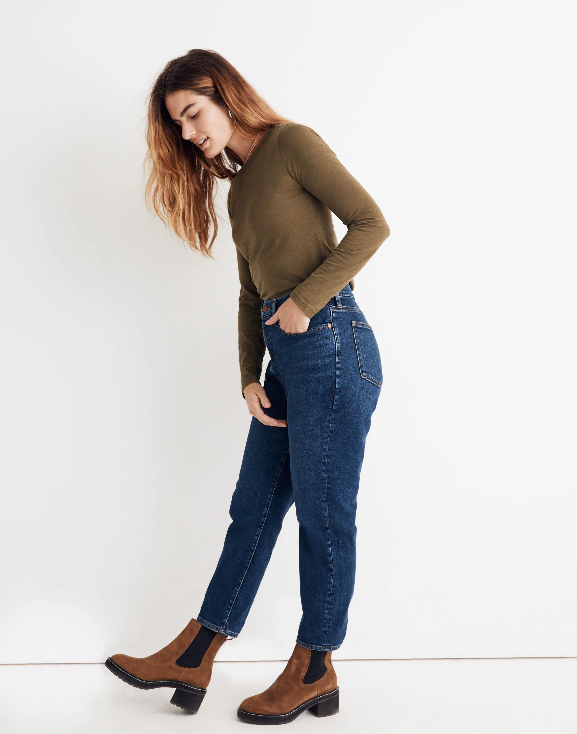The cut: the ultimate momjean, this superhigh-rise fit has perfectly tapered legs. The fabric: Denim that combines the holds-you-in structure of rigid with a touch of stretch for day-one comfort.