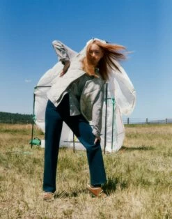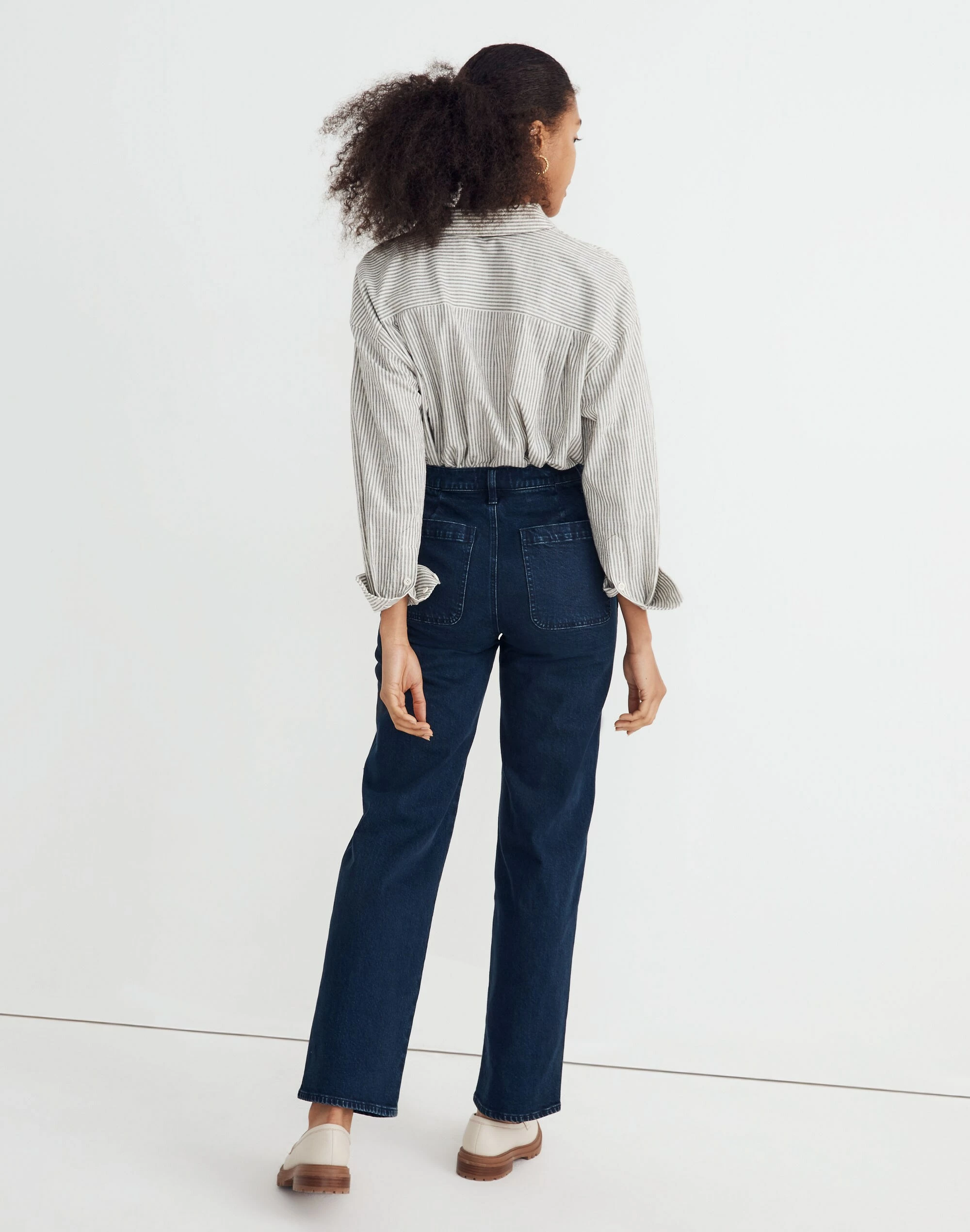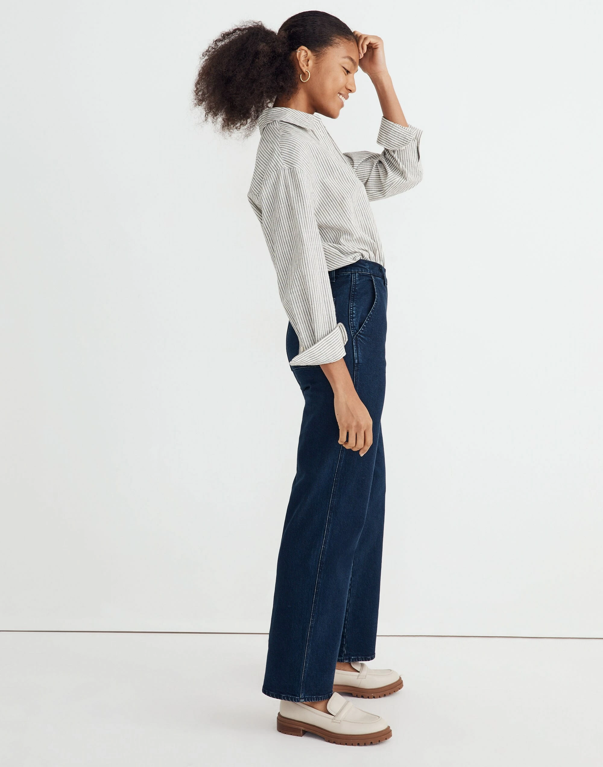 The cut: a wide-legged addition to our Perfect Vintage fam, these vintage-inspired jeans have a high fitted waist with slant pockets and a retro-style zipper opening on the hip. The fabric: Old-school structured denim with a touch of stretch for a broken-in feel.