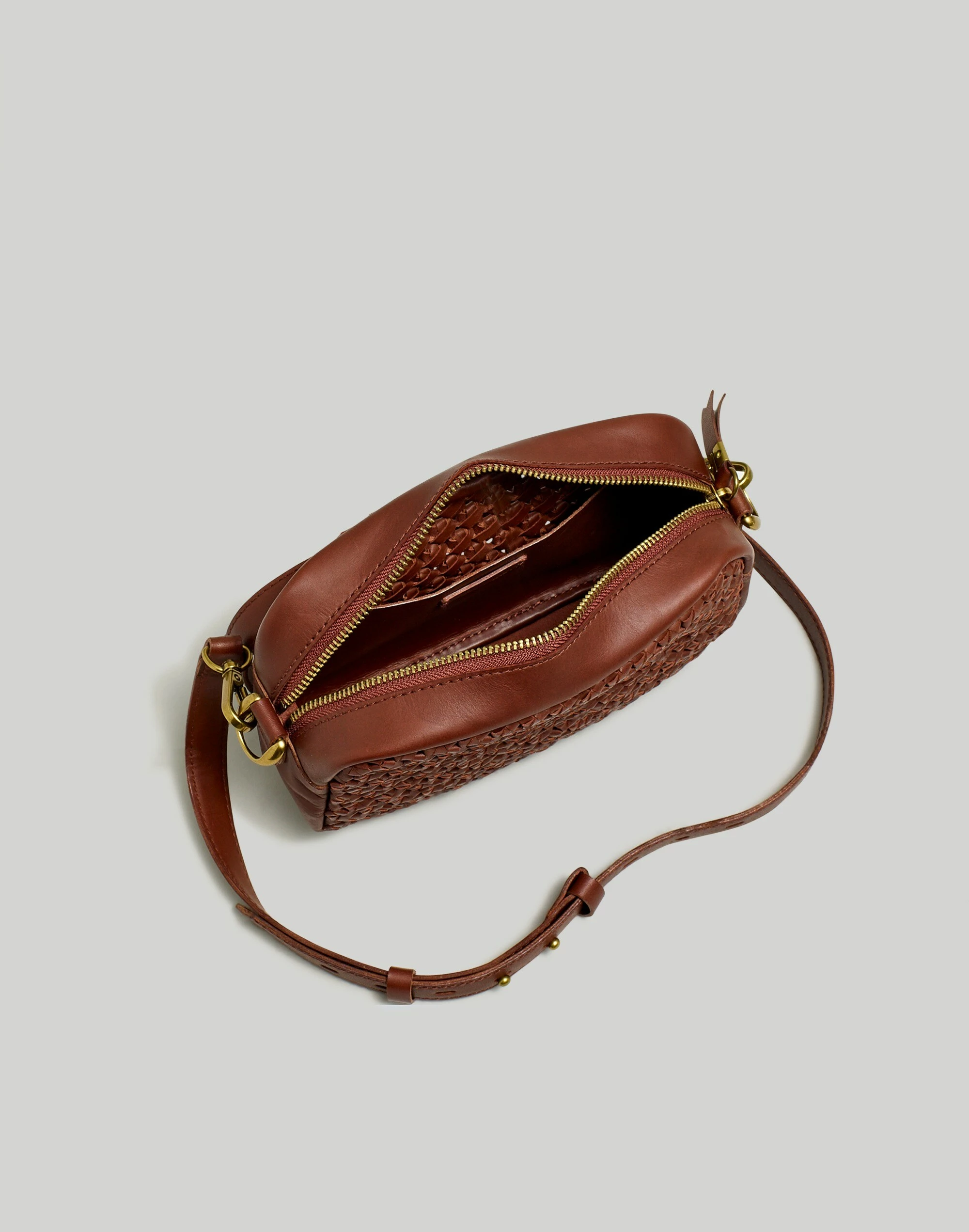 Part of our signature Transport collection, this crocheted leather bag is cool, convenient and customizable with an adjustable (and removable) shoulder strap. Picture-perfectly sized to hold your keys, wallet, lip balm and smartphone—or, you know, a disposable camera.