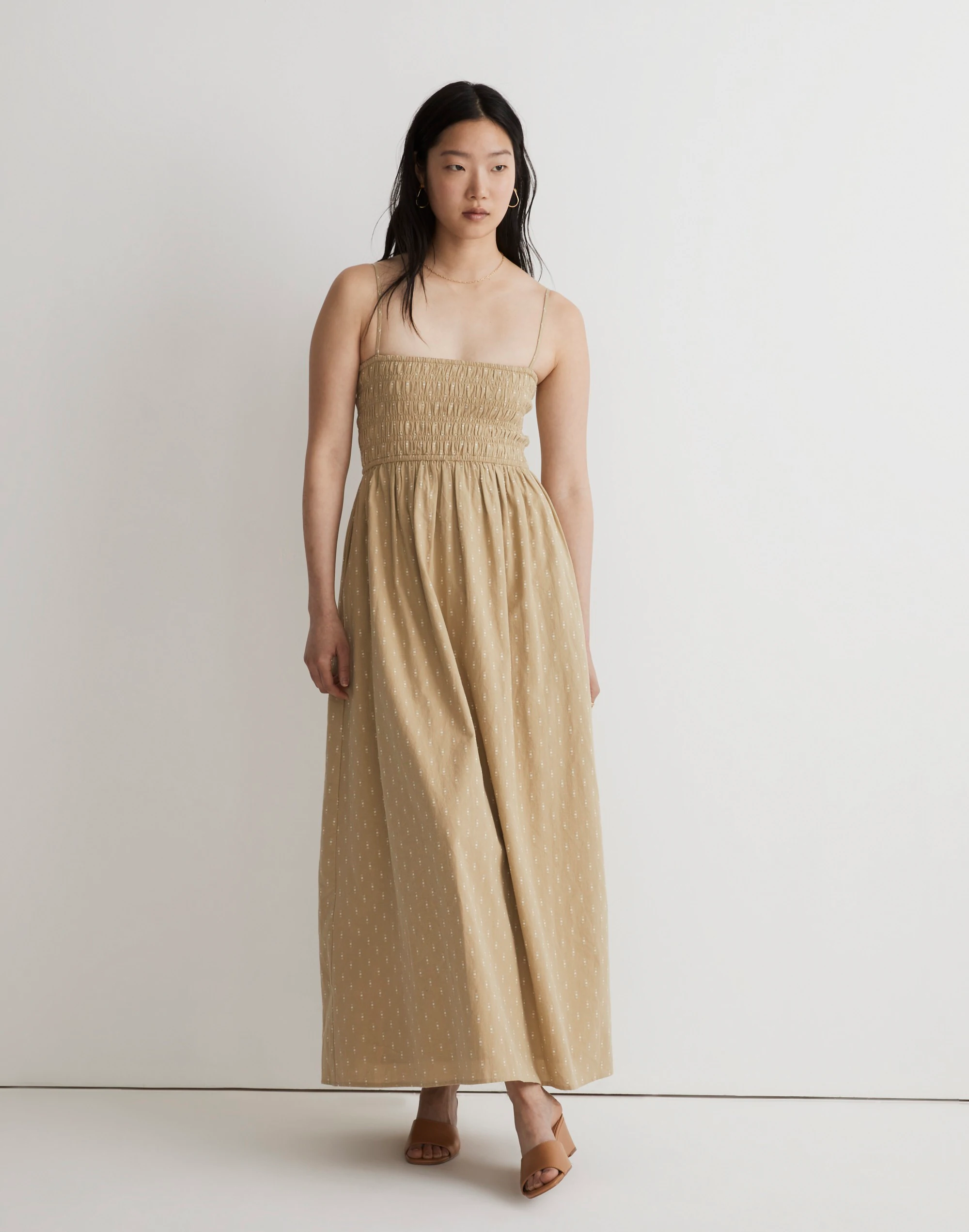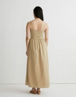 In a geometric jacquard, this sleeveless midi dress is smocked through the bodice with a high empire waist and easy A-line skirt. Light and airy in cotton dobby, just slip it on and go.