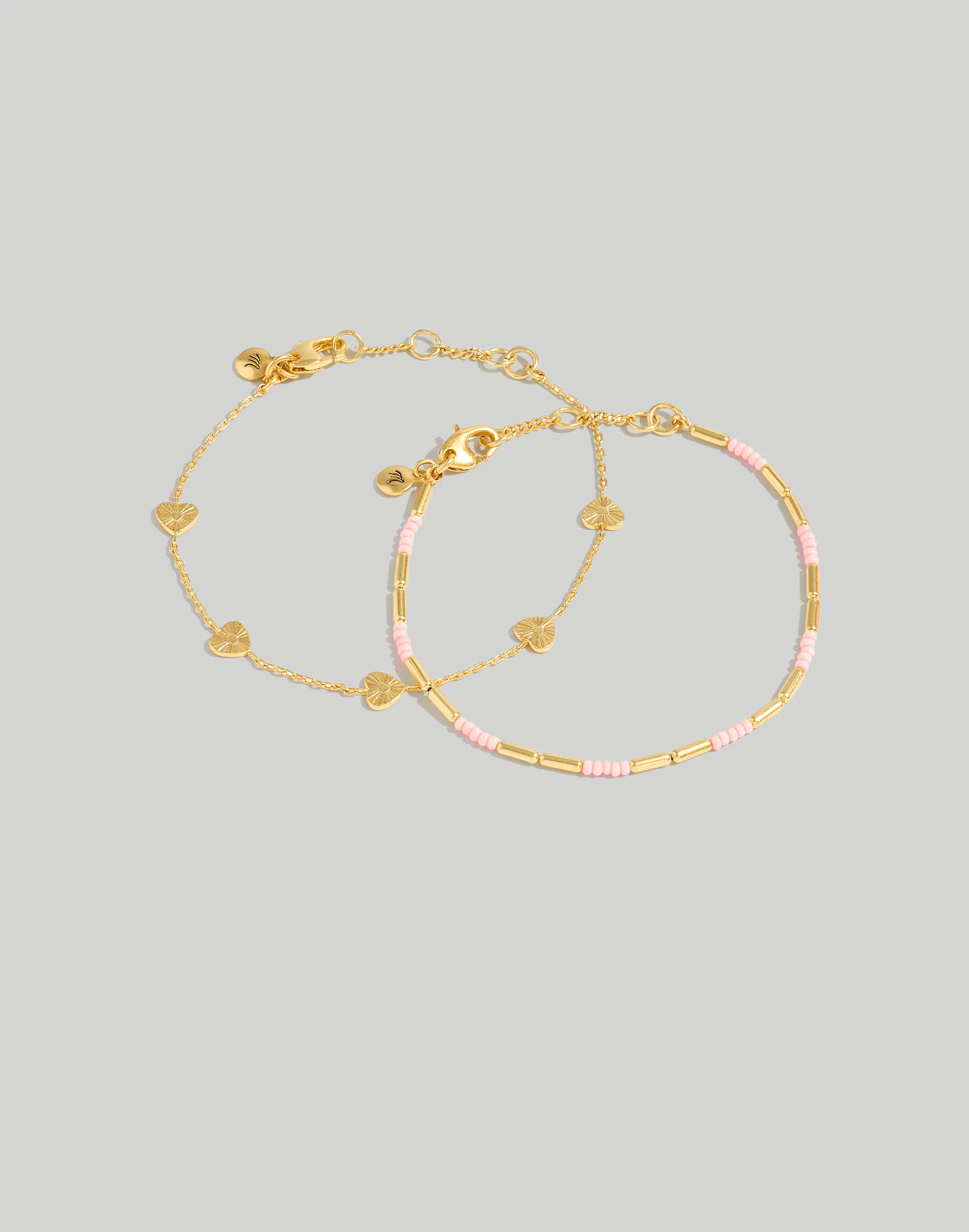 Coming in gold-plated recycled brass, this bracelet set features etched heart charms and colorful seed beads. It’s so cute (and such an easy gift) paired with the matching necklace.