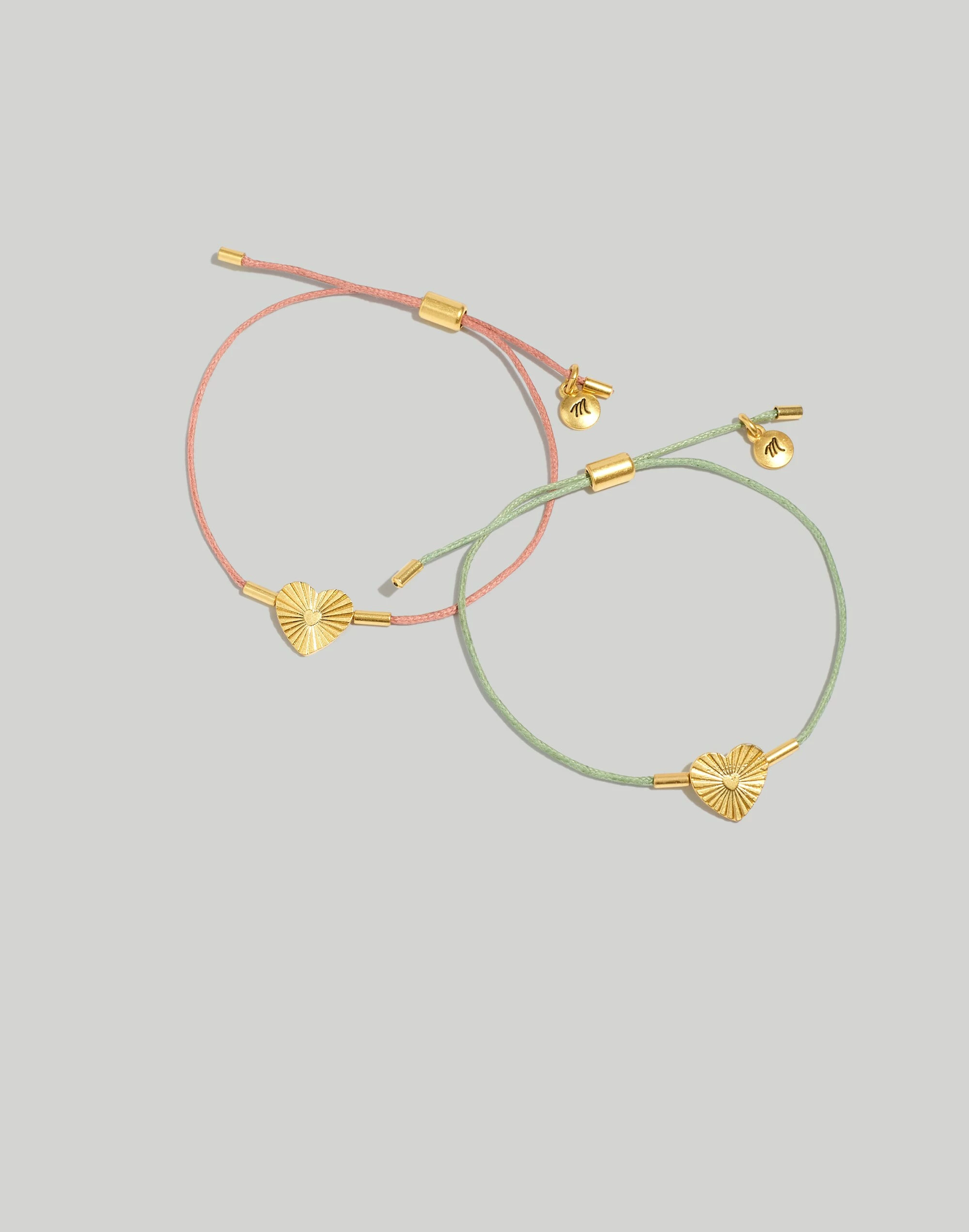 One for you, one for your BFF—the etched heart-shaped charms on these cotton cord bracelets go together as well as you do.