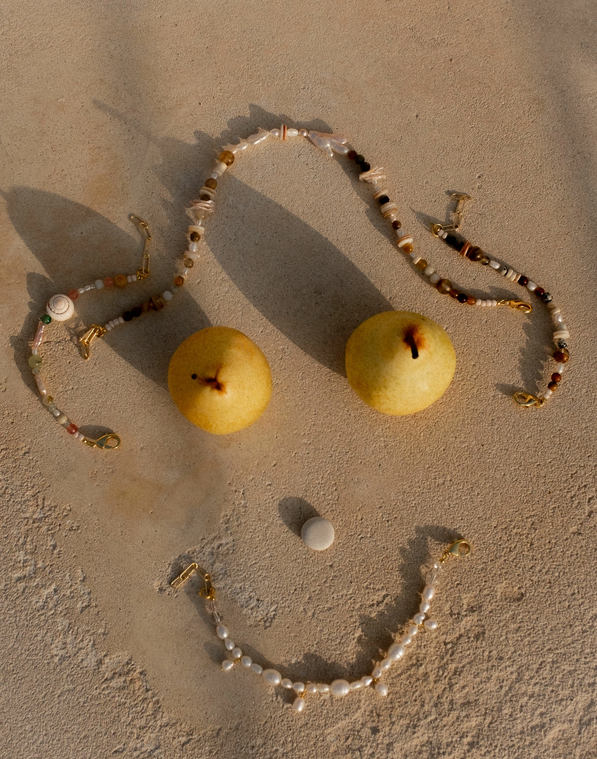 - Branch pearl, freshwater pearls, tree agate, tourmaline quartz, tiger’s eye, red jasper, fire quartz, seashells, 18k gold-plated clasp and chain.